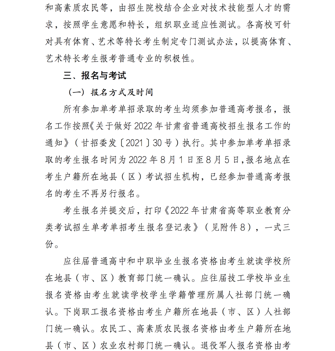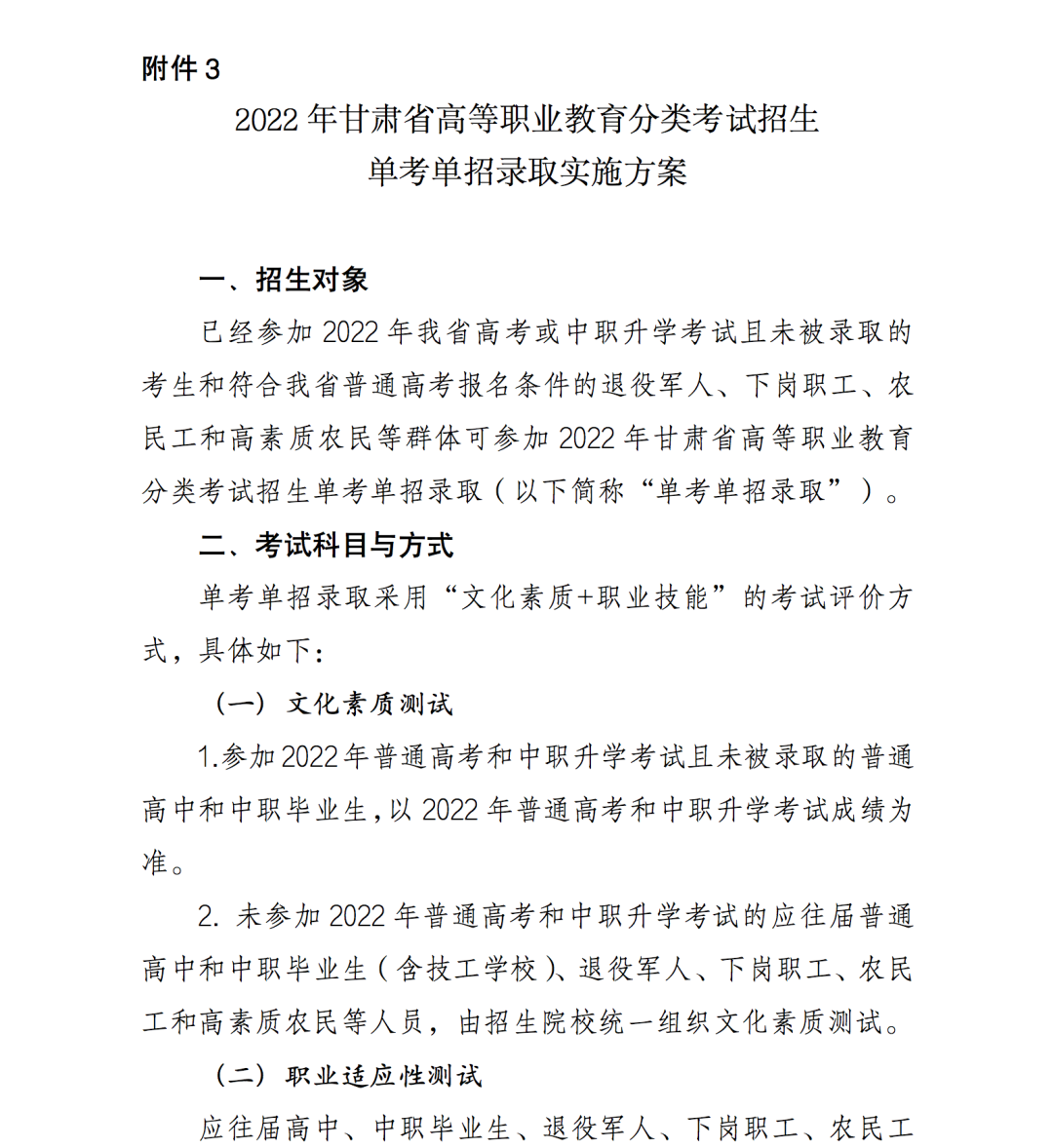 3.2022年甘肅省高等職業(yè)教育分類考試招生單考單招實(shí)施方案