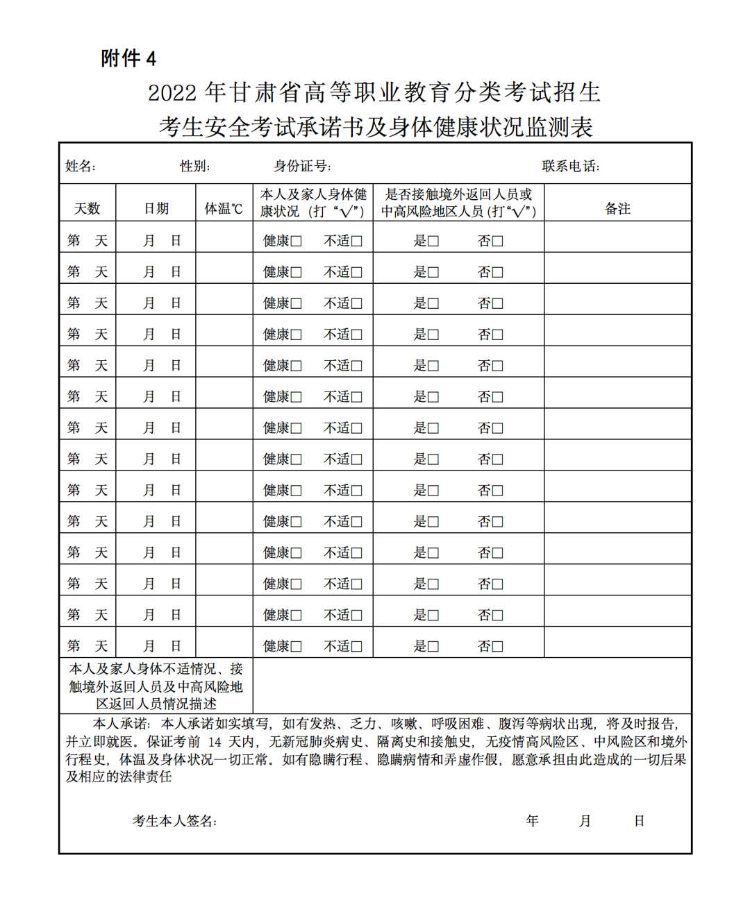 4.2022年甘肅省高等職業(yè)教育分類考試招生考生安全考試承諾書(shū)及身體健康狀況監(jiān)測(cè)表
