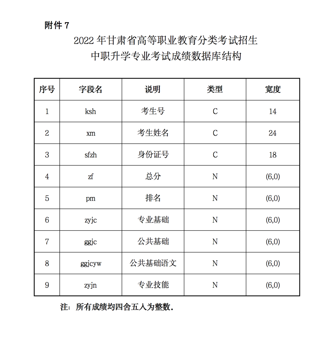 7.2022年甘肅省高等職業(yè)教育分類考試招生中職升學(xué)考試成績(jī)數(shù)據(jù)庫(kù)結(jié)構(gòu)