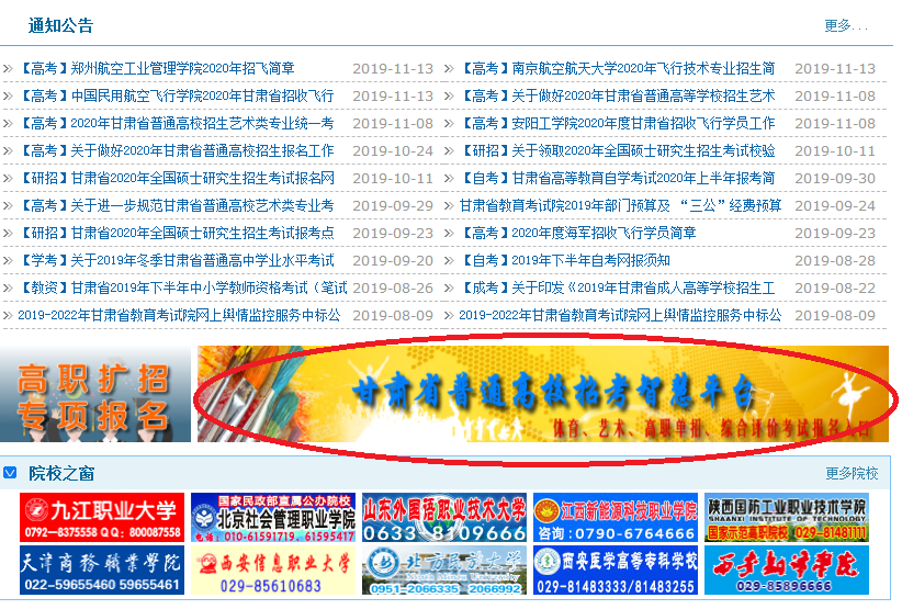 點擊“通知公告”欄目下方的“甘肅省普通高校招考智慧平臺”。