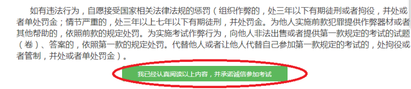 《考生須知》閱讀完成后,請開始閱讀《報考承諾書》,閱讀完成后請點擊“我已經(jīng)認(rèn)真閱讀以上內(nèi)容,并承諾誠信參加考試”。