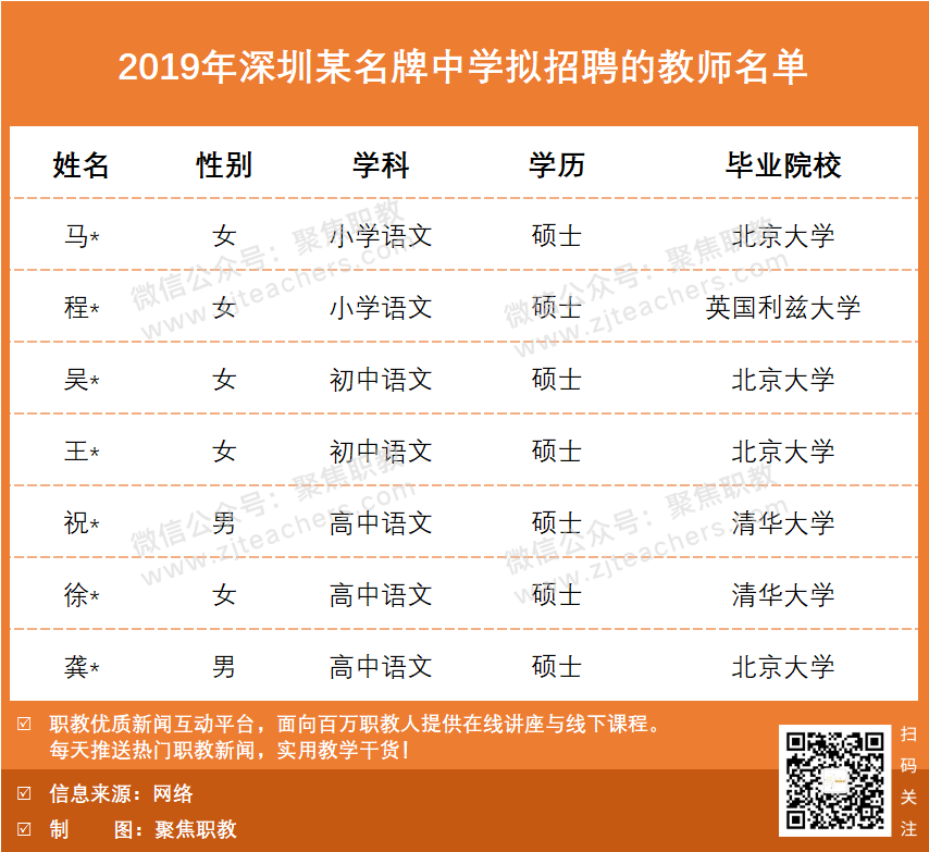 2019年深圳某名牌中學(xué)擬招聘的教師名單走紅網(wǎng)絡(luò),超“豪華”的師資陣容曾經(jīng)霸占熱搜。圖表顯示,該學(xué)校擬聘的中小學(xué)教師,清一色的北大、清華等國內(nèi)外名校的碩士、博士,被網(wǎng)友喻為“史上最豪華小學(xué)教師團(tuán)隊”。而該校相關(guān)負(fù)責(zé)人在回應(yīng)熱議時說,這只是部分招聘信息,學(xué)校對其他學(xué)校、本科學(xué)歷的畢業(yè)生也招,但肯定想優(yōu)中選優(yōu)。一起來感受下這份名單對高職生的“暴虐”: