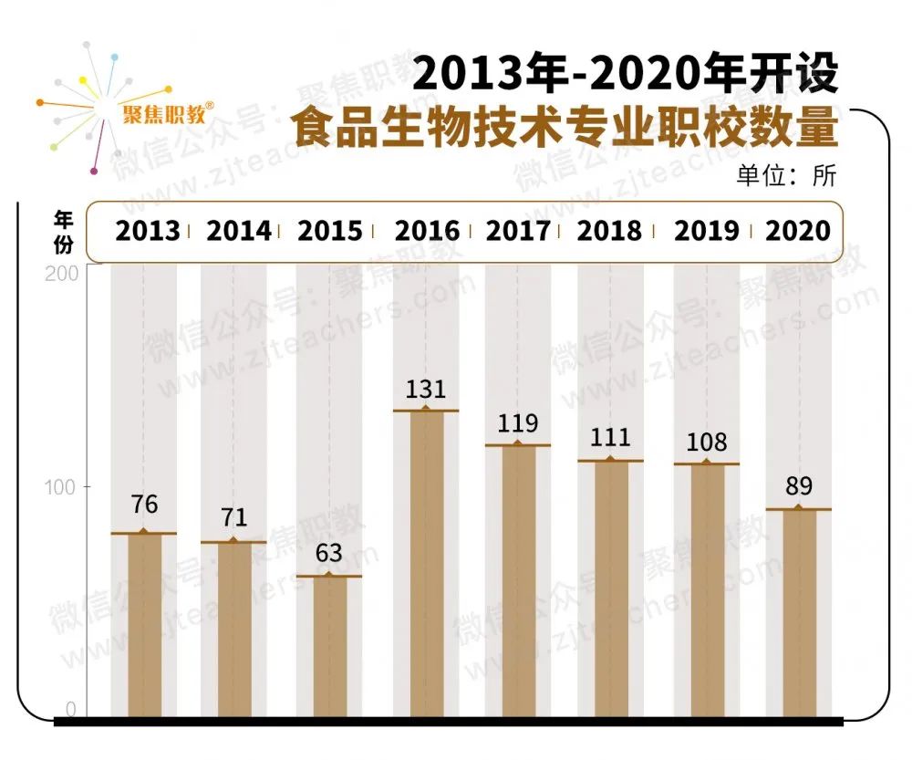2013年-2015年開設(shè)食品生物技術(shù)專業(yè)的職校數(shù)量都在100個以下。雖然2016年該專業(yè)開設(shè)數(shù)量出現(xiàn)井噴式增長,但隨即又遭遇滑鐵盧,在今年又回跌到100個以下,再次證實(shí)“專科最忌四大業(yè),生物、醫(yī)學(xué)、金融和IT”的坊間傳說不虛。