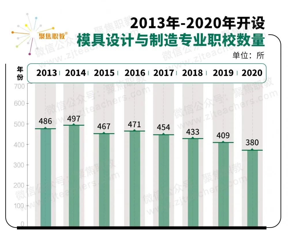 近七年,高職院校開設(shè)模具設(shè)計與制造專業(yè)數(shù)量總體呈下滑趨勢。2020年更是縮減到400個以下。在制造業(yè)領(lǐng)域,模具設(shè)計與制造專業(yè)不可或缺,是裝備制造業(yè)發(fā)展的柱石,也是衡量制造業(yè)水平的重要標(biāo)志。隨著我國工業(yè)技術(shù)的急速發(fā)展,工業(yè)產(chǎn)品的要求也越來越高,與之對應(yīng)的模具發(fā)展也越來越快。盡管目前模具行業(yè)的人才缺口很大,但職業(yè)院校的培養(yǎng)卻跟不上行業(yè)技術(shù)發(fā)展,畢業(yè)生在就業(yè)后被吐槽上手慢,企業(yè)還要花較大力氣進(jìn)行培訓(xùn)。因此,企業(yè)對該專業(yè)的畢業(yè)生招聘需求也就隨之減弱。