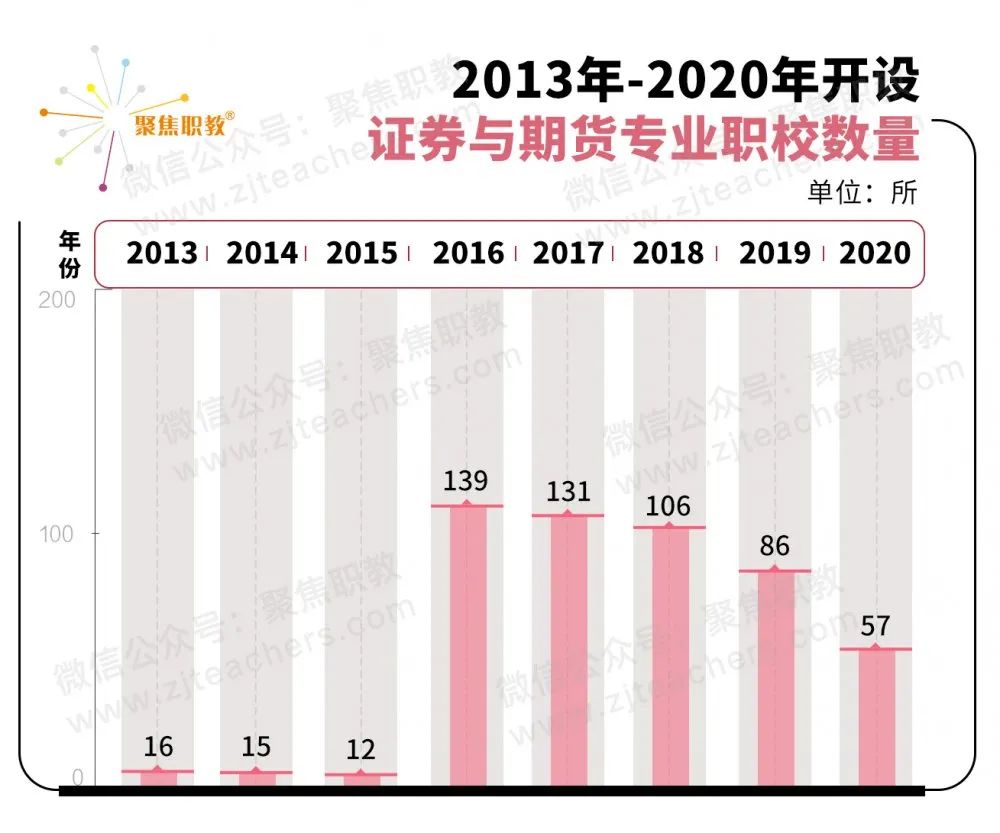 開設(shè)證券與期貨專業(yè)的高職院校數(shù)量,從2015年的12個一下子激增到2016年的139個。隨即,該專業(yè)開設(shè)數(shù)量幾乎呈直線式下滑,一路減少至57個。在默默消失的路上,證券與期貨專業(yè)從未停下過腳步。開設(shè)數(shù)量在高職院校過山車式的起伏,足見學(xué)生家長和學(xué)校都對該專業(yè)持猶疑態(tài)度。