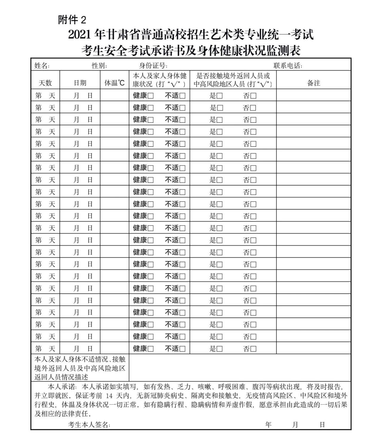2.考生須從考前14天開始做好每日體溫測(cè)量、記錄并進(jìn)行健康狀況監(jiān)測(cè),如實(shí)填寫《2021年甘肅省普通高校招生藝術(shù)類專業(yè)統(tǒng)一考試考生安全考試承諾書及身體健康狀況監(jiān)測(cè)表》(見附件2)。出現(xiàn)異常情況的,要及時(shí)報(bào)告學(xué)?;蚩h(區(qū))教育考試招生機(jī)構(gòu),并進(jìn)行診療和排查。