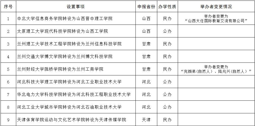 教育部發(fā)展規(guī)劃司表示,根據(jù)《高等教育法》《普通高等學(xué)校設(shè)置暫行條例》《普通本科學(xué)校設(shè)置暫行規(guī)定》和《關(guān)于加快推進(jìn)獨(dú)立學(xué)院轉(zhuǎn)設(shè)工作的實(shí)施方案》等法律法規(guī)政策規(guī)定,經(jīng)第七屆全國高等學(xué)校設(shè)置評議委員會專家考察和評議,并經(jīng)黨組會審議,