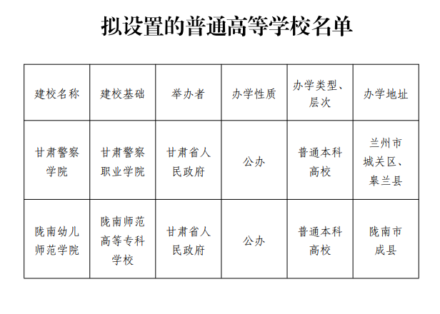 根據(jù)《中華人民共和國(guó)高等教育法》《普通高等學(xué)校設(shè)置暫行條例》《教育部關(guān)于“十四五”時(shí)期高等學(xué)校設(shè)置工作的意見(jiàn)》等有關(guān)規(guī)定,對(duì)擬向教育部申報(bào)的以甘肅警察職業(yè)學(xué)院為基礎(chǔ)設(shè)置甘肅警察學(xué)院、以隴南師范高等??茖W(xué)校為基礎(chǔ)設(shè)置隴南幼兒師范學(xué)院進(jìn)行公示,公示時(shí)間為9月18日至9月22日。