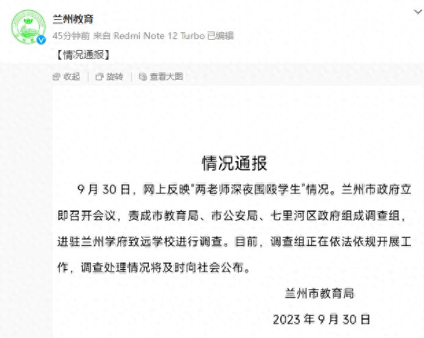 最新的消息是,針對網(wǎng)上反映“兩老師深夜圍毆學(xué)生”情況,蘭州市政府立即召開會議,責(zé)成市教育局、市公安局、七里河區(qū)政府組成調(diào)查組進(jìn)駐蘭州學(xué)府致遠(yuǎn)學(xué)校進(jìn)行調(diào)查。目前,調(diào)查組正在依法依規(guī)開展工作,調(diào)查處理情況將及時向社會公布。