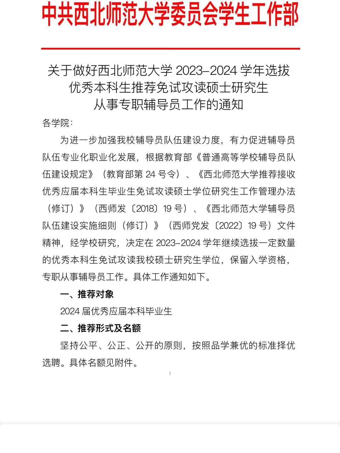 一、學(xué)生:公示結(jié)束前一天被告知取消資格根據(jù)西北師范大學(xué)研究生院官網(wǎng)發(fā)布的《關(guān)于做好2024年推薦優(yōu)秀應(yīng)屆本科畢業(yè)生免試攻讀碩士研究生工作的通知》,除“農(nóng)碩師資計(jì)劃”外,9月20日,學(xué)校對(duì)學(xué)院擬推薦學(xué)生進(jìn)行全面審核,確定2024年學(xué)校擬推薦名單。9月20日至29日,學(xué)校對(duì)擬推薦名單進(jìn)行公示,公示期為10天。趙琴告訴中新網(wǎng),9月20日保研名單公布后,她和同學(xué)們積極投遞相關(guān)材料,參加面試。在9月29日凌晨開始填報(bào)志愿前,大部分學(xué)生已通過(guò)面試,聯(lián)系好了學(xué)校和導(dǎo)師,但是9月28日下午兩點(diǎn)左右突然被通知保研資格被取消。根據(jù)她提供的西北師范大學(xué)《2024年推薦優(yōu)秀應(yīng)屆本科畢業(yè)生免試攻讀碩士學(xué)位研究生名單》,該校保研包括普通推免、“本碩一體化”、“輔導(dǎo)員”專項(xiàng)計(jì)劃、“農(nóng)村學(xué)校教育碩士師資培養(yǎng)計(jì)劃”專項(xiàng)(簡(jiǎn)稱‘農(nóng)碩’)、“研究生支教團(tuán)”專項(xiàng)等。中新網(wǎng)注意到,上述名單在學(xué)校官網(wǎng)已被刪除。韓永是報(bào)名“輔導(dǎo)員”專項(xiàng)的學(xué)生之一。他回憶道,被通知撤回推免資格時(shí),班主任稱“研究生院老師解讀文件錯(cuò)誤,‘輔導(dǎo)員’專項(xiàng)是不符合保研政策的,而且在公示期內(nèi),取消資格是合適的?!钡钏苫蟮氖牵巴泼夤ぷ鏖_始時(shí),有明確的紅頭文件說(shuō)明了有‘輔導(dǎo)員’專項(xiàng)。而且這個(gè)每年都有,往年學(xué)院都有固定人數(shù)?!?/section>“我們學(xué)院所有‘輔導(dǎo)員’專項(xiàng)保研的同學(xué)都被取消了資格?!表n永說(shuō)。據(jù)西北師范大學(xué)官網(wǎng)9月16日發(fā)布的《關(guān)于做好2024年推薦優(yōu)秀應(yīng)屆本科畢業(yè)生免試攻讀碩士研究生工作的通知》,“輔導(dǎo)員”實(shí)行“1+基本學(xué)制”培養(yǎng)模式,即大四畢業(yè)后專職輔導(dǎo)員一年。服務(wù)期滿后根據(jù)接收“推免生”基本學(xué)制和專業(yè)攻讀該校研究生。趙琴也證實(shí)了“輔導(dǎo)員”專項(xiàng)保研名額被取消這一點(diǎn)。她還介紹,被取消名額的并不是排名在最后面的,而是“前幾名順利保研,后幾名順利簽約‘農(nóng)碩’,取消資格的是中間的部分。”據(jù)她介紹,“學(xué)校的解釋是‘農(nóng)碩’的同學(xué)雖然排名在后,但是已經(jīng)簽約,木已成舟,無(wú)法改變,只能取消我們的?!?/section>二、西北師范大學(xué):工作人員嚴(yán)重失誤西北師范大學(xué)在通報(bào)中稱,該校在推薦2024年優(yōu)秀應(yīng)屆本科畢業(yè)生免試攻讀研究生工作過(guò)程中,因工作人員出現(xiàn)嚴(yán)重工作失誤,導(dǎo)致推免研究生公示人數(shù)超過(guò)推免計(jì)劃名額。發(fā)現(xiàn)問(wèn)題后,學(xué)校已將超額推免計(jì)劃名額撤回,并向受到影響的同學(xué)做了解釋說(shuō)明。根據(jù)一份網(wǎng)傳文件截圖,2024屆優(yōu)秀應(yīng)屆本科畢業(yè)生推薦免試攻讀碩士生名額分配表顯示共有702個(gè)名額,較上屆有所增加。韓永稱,多出來(lái)的名額是普通推免的名額,當(dāng)時(shí)只是認(rèn)為保研政策形勢(shì)利好,多加了普通推免的名額,并未覺(jué)得不妥。