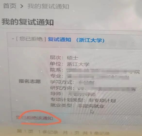 據(jù)報道,四川廣安一名大學(xué)生此前已經(jīng)通過了浙大的保研復(fù)試考核。她登陸研究生招生信息網(wǎng)收到了浙江大學(xué)的保研復(fù)試通知,結(jié)果由于情緒激動,而通知頁面上的“拒絕”選項在“接受”之前,這名同學(xué)錯點了“拒絕”。好在她及時聯(lián)系學(xué)院招生老師,溝通后重新提交了志愿,最終被順利錄取。該話題隨后沖上熱搜。