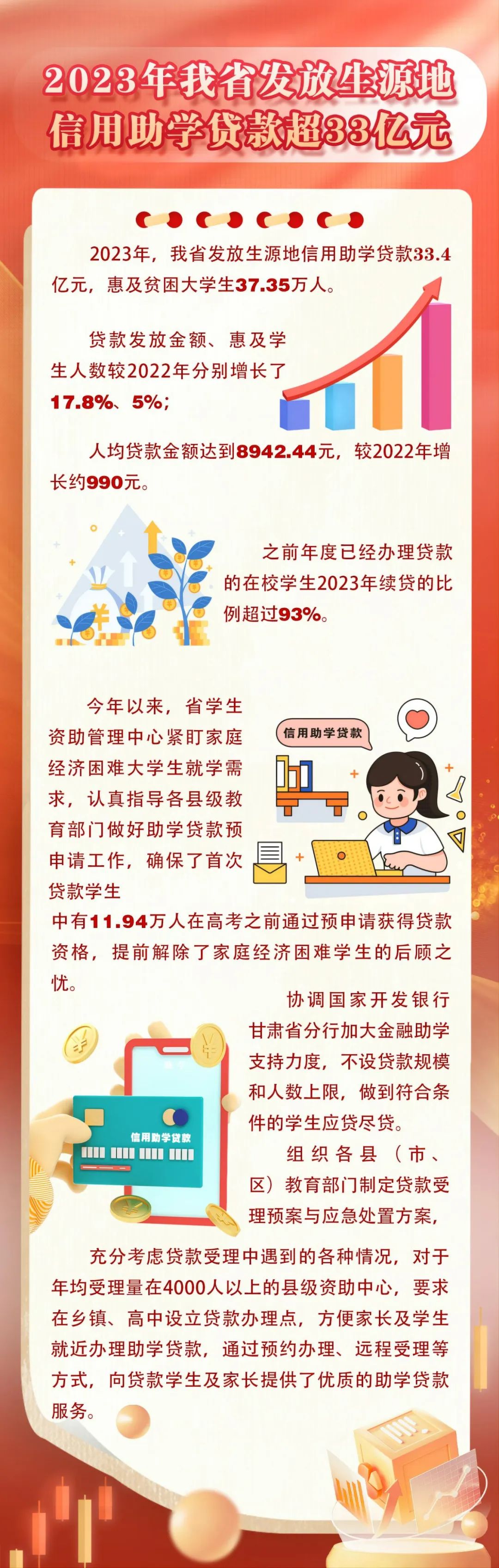 近日,記者從甘肅省教育廳了解到,2023年,甘肅發(fā)放生源地信用助學(xué)貸款33.4億元,惠及貧困大學(xué)生37.35萬人。貸款發(fā)放金額、惠及學(xué)生人數(shù)較2022年分別增長了17.8%、5%;人均貸款金額達(dá)到8942.44元,較2022年增長約990元。