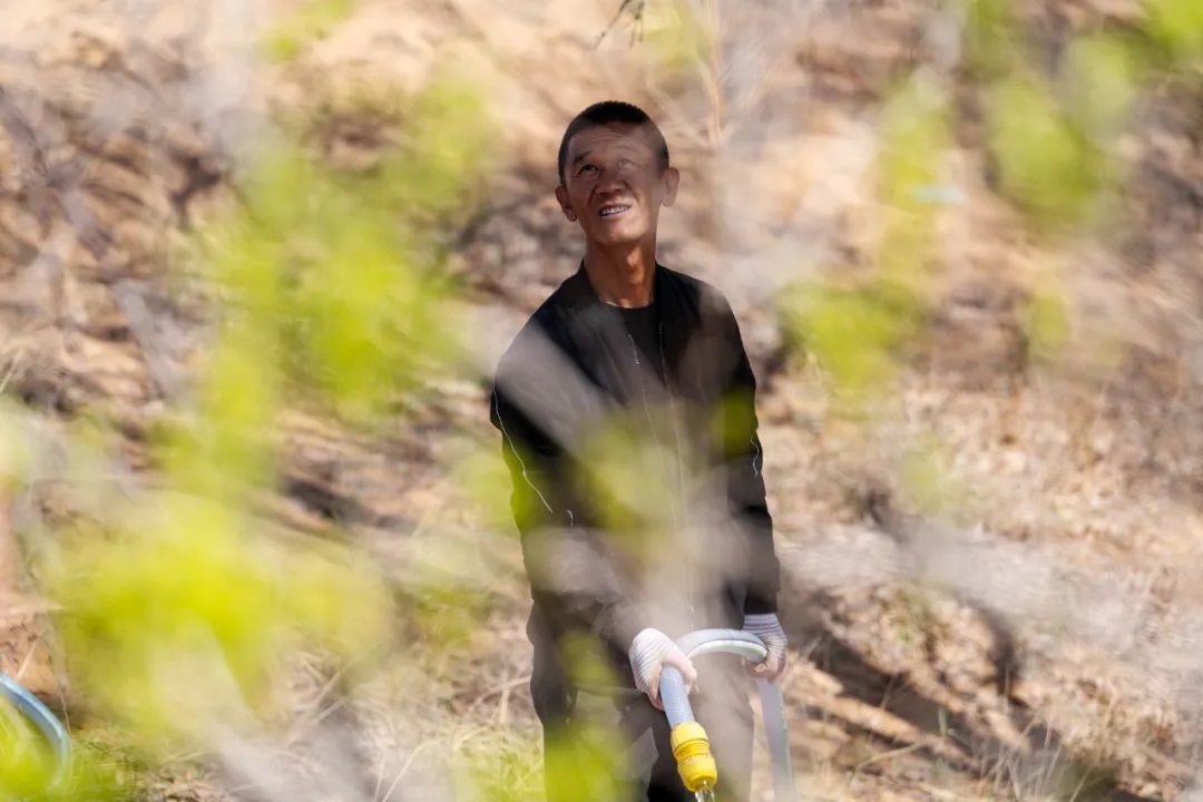 2024年4月10日,在甘肅省武威市古浪縣八步沙林場,郭璽澆灌植被。新華社記者 費茂華 攝