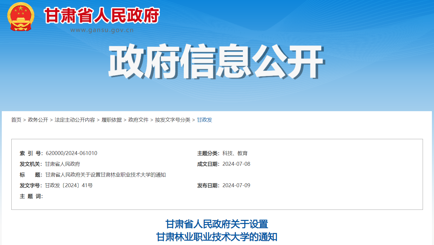7月23日,甘肅省人民政府官網(wǎng)發(fā)布《甘肅省人民政府關(guān)于設(shè)置甘肅林業(yè)職業(yè)技術(shù)大學(xué)的通知》,省政府決定,即日起在甘肅林業(yè)職業(yè)技術(shù)學(xué)院的基礎(chǔ)上設(shè)置甘肅林業(yè)職業(yè)技術(shù)大學(xué),同時撤銷甘肅林業(yè)職業(yè)技術(shù)學(xué)院建制。