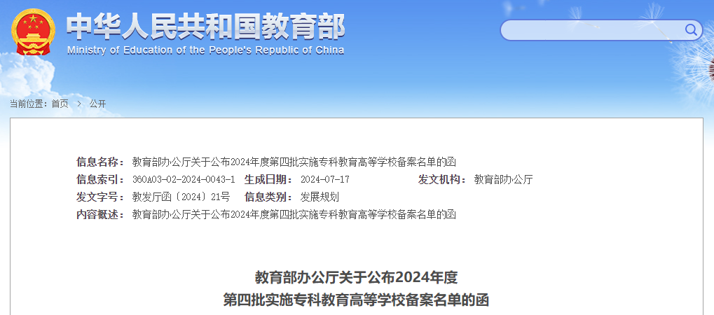 教育部公布2024年度第四批實(shí)施專(zhuān)科教育高等學(xué)校備案名單。
