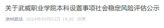 公眾號 涼州政法 消息,武威職業(yè)學院本科設(shè)置事項社會穩(wěn)定風險評估公示中。