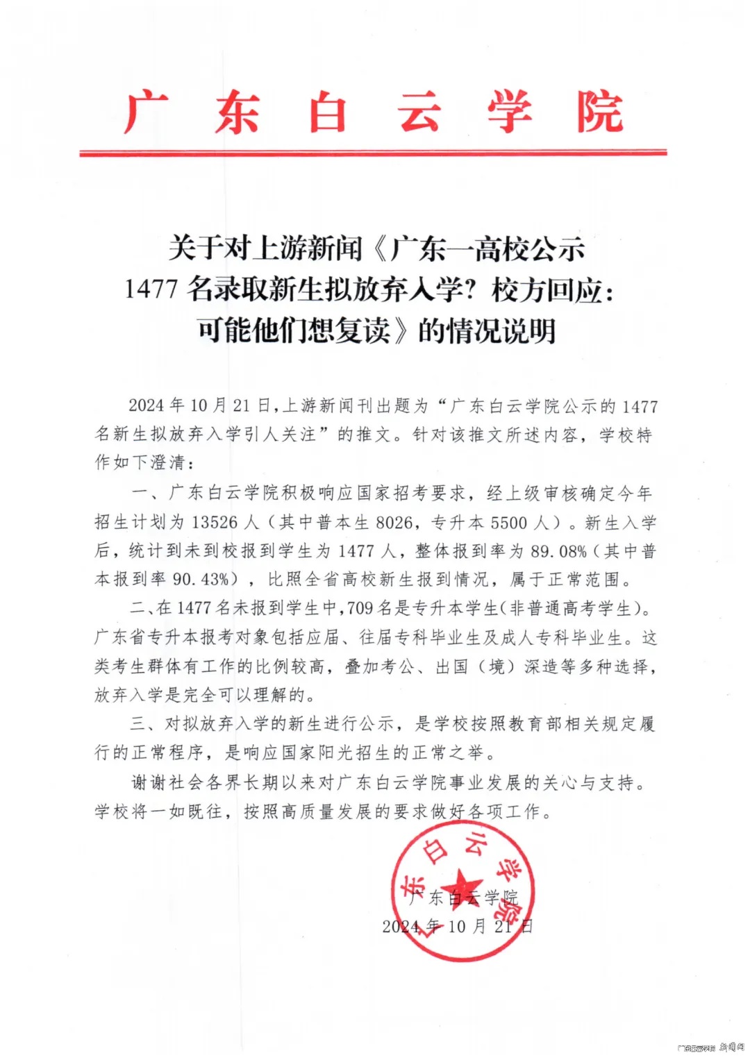 據(jù)人民日報客戶端消息,近日,廣東白云學院公示1477名新生擬放棄入學的消息登上微博熱搜,引發(fā)關(guān)注。10月21日,廣東白云學院對此發(fā)布情況說明:2024年10月21日,上游新聞刊出題為“廣東白云學院公示的1477名新生擬放棄入學引人關(guān)注”的推文。針對該推文所述內(nèi)容,學校特作如下澄清:一、廣東白云學院積極響應國家招考要求,經(jīng)上級審核確定今年招生計劃為13526人(其中普本生8026,專升本5500人)。新生入學后,統(tǒng)計到未到校報到學生為1477人,整體報到率為89.08%(其中普本報到率90.43%),比照全省高校新生報到情況,屬于正常范圍。二、在1477名未報到學生中,709名是專升本學生(非普通高考學生)。廣東省專升本報考對象包括應屆、往屆??飘厴I(yè)生及成人專科畢業(yè)生。這類考生群體有工作的比例較高,疊加考公、出國(境)深造等多種選擇,放棄入學是完全可以理解的。三、對擬放棄入學的新生進行公示,是學校按照教育部相關(guān)規(guī)定履行的正常程序,是響應國家陽光招生的正常之舉。謝謝社會各界長期以來對廣東白云學院事業(yè)發(fā)展的關(guān)心與支持。學校將一如既往,按照高質(zhì)量發(fā)展的要求做好各項工作。據(jù)該校官網(wǎng)介紹,廣東白云學院創(chuàng)建于1989年,是教育部批準成立的全日制普通本科院校。2009年通過學士學位授予單位授權(quán)點評審,2011年通過教育部本科教學工作合格評估,2018年接受教育部本科教學工作審核評估。2022年獲批廣東省博士工作站。學校位于廣東省廣州市,現(xiàn)有兩個校區(qū),西校區(qū)位于白云區(qū)江高鎮(zhèn),北校區(qū)位于白云區(qū)鐘落潭高校園區(qū),面向全國17個省(自治區(qū))招生,目前擁有全日制在校生33600多人。