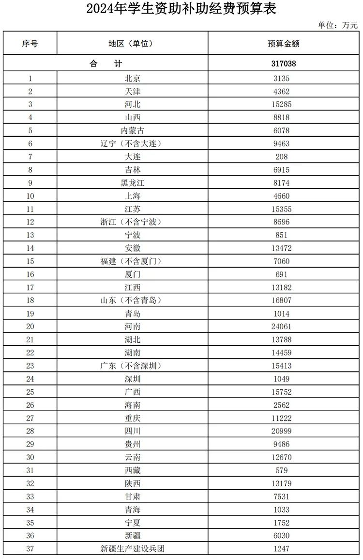 下達(dá)2024年學(xué)生資助補(bǔ)助經(jīng)費(fèi)預(yù)算,預(yù)算總金額317038萬(wàn)元。