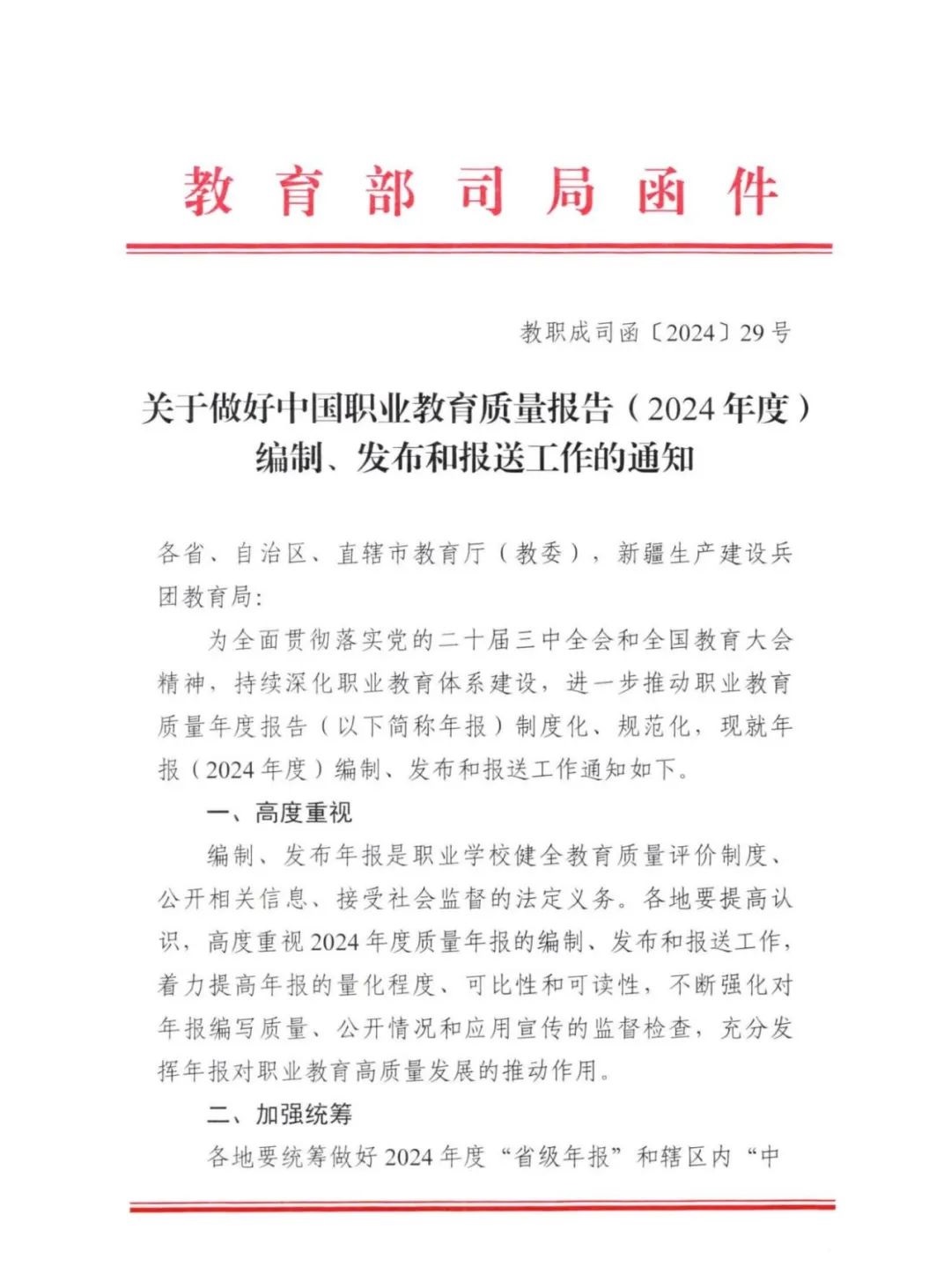 為全面貫徹黨的二十屆三中全會(huì)和全國教育大會(huì)精神,持續(xù)深化職業(yè)教育體系建設(shè),教育部職業(yè)教育與成人教育司近日發(fā)布了《關(guān)于做好中國職業(yè)教育質(zhì)量報(bào)告(2024年度)編制、發(fā)布和報(bào)送工作的通知》(教職成司函〔2024〕29號),以下簡稱《通知》。