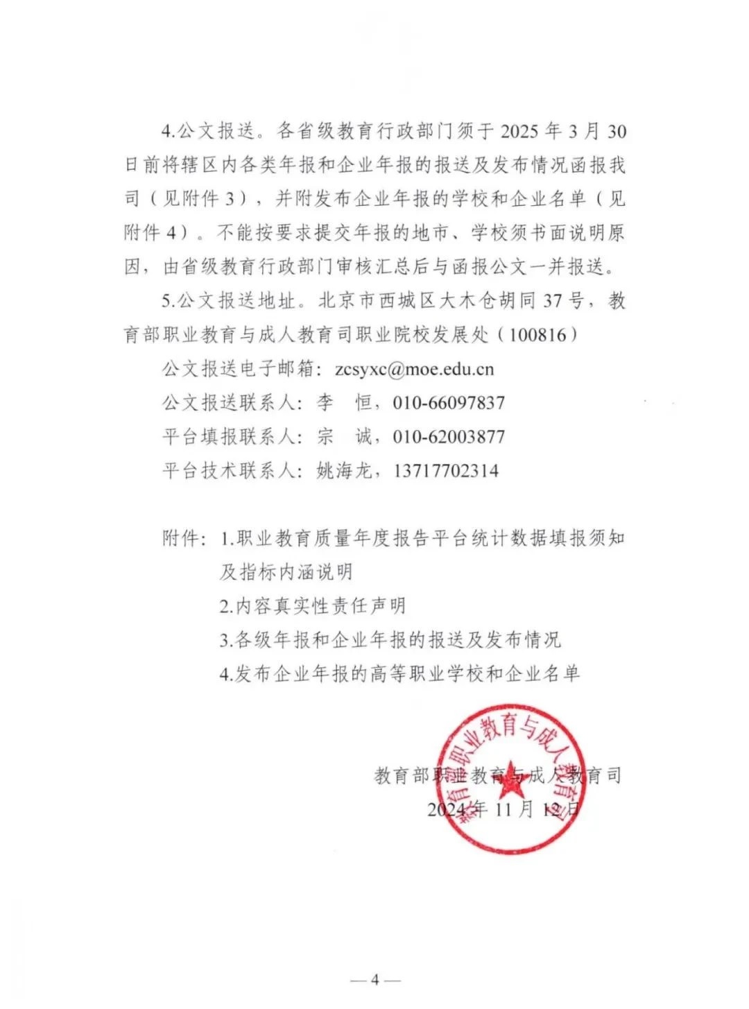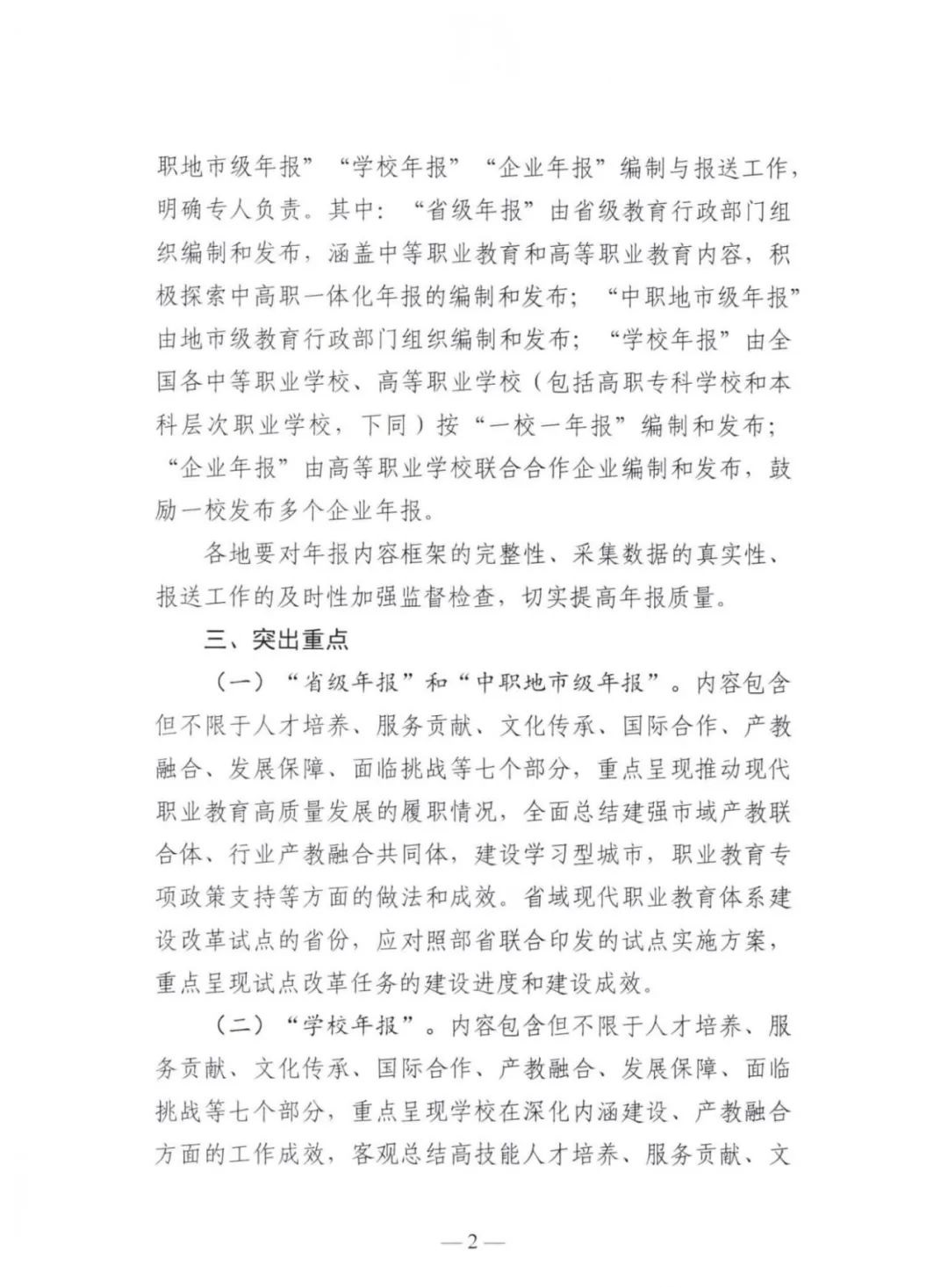 在統(tǒng)籌工作方面,《通知》要求各地統(tǒng)籌做好省級年報(bào)、中職地市級年報(bào)、學(xué)校年報(bào)和企業(yè)年報(bào)的編制與報(bào)送工作,并明確專人負(fù)責(zé)。省級年報(bào)由省級教育行政部門組織編制和發(fā)布,涵蓋中等職業(yè)教育和高等職業(yè)教育內(nèi)容。中職地市級年報(bào)由地市級教育行政部門組織編制和發(fā)布。學(xué)校年報(bào)由全國各中等職業(yè)學(xué)校、高等職業(yè)學(xué)校按“一校一年報(bào)”編制和發(fā)布。企業(yè)年報(bào)由高等職業(yè)學(xué)校聯(lián)合合作企業(yè)編制和發(fā)布。