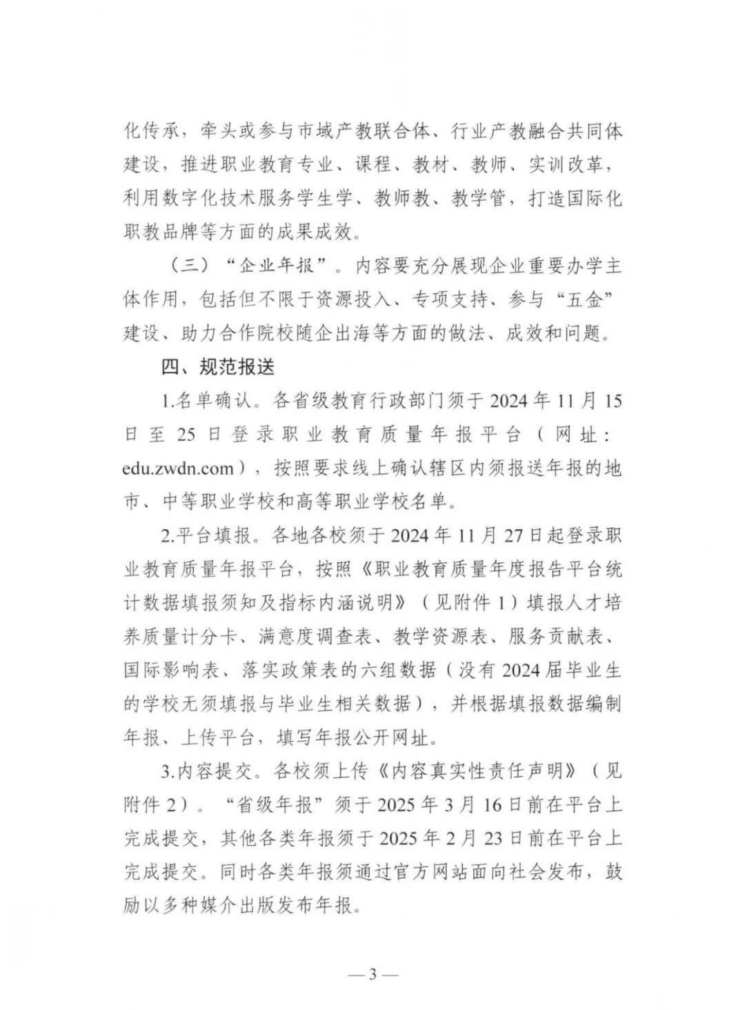 在規(guī)范報(bào)送方面,《通知》明確了名單確認(rèn)、平臺(tái)填報(bào)、內(nèi)容提交、公文報(bào)送等具體流程和時(shí)間節(jié)點(diǎn)。各省級教育行政部門須于2025年3月30日前將轄區(qū)內(nèi)各類年報(bào)和企業(yè)年報(bào)的報(bào)送及發(fā)布情況函報(bào)教育部職業(yè)教育與成人教育司,并附發(fā)布企業(yè)年報(bào)的學(xué)校和企業(yè)名單。