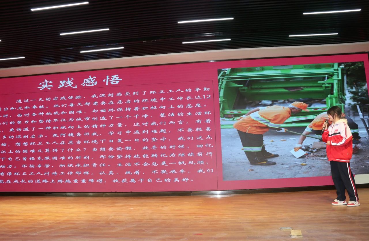 高一(11)班和高一(12)班的駱曉田同學(xué)匯報(bào)了了解環(huán)衛(wèi)工人的實(shí)踐成果。她呼吁大家尊重每一位勞動(dòng)者,愛(ài)護(hù)環(huán)境。駱曉田表示:“通過(guò)與環(huán)衛(wèi)工人張阿姨的接觸,我深刻感受到她們工作的艱辛與不易。作為新時(shí)代的中學(xué)生,我們應(yīng)該從自身做起,愛(ài)護(hù)環(huán)境,尊重每一位勞動(dòng)者的辛勤付出。