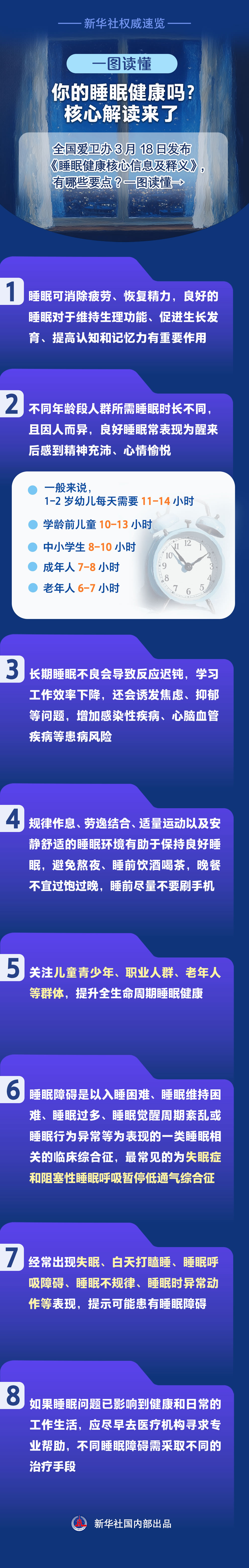 全國愛衛(wèi)辦18日發(fā)布《睡眠健康核心信息及釋義》,推薦成年人晚上10至11點入睡,早晨6至7點起床,其中老年人可早晨5至6點起床。