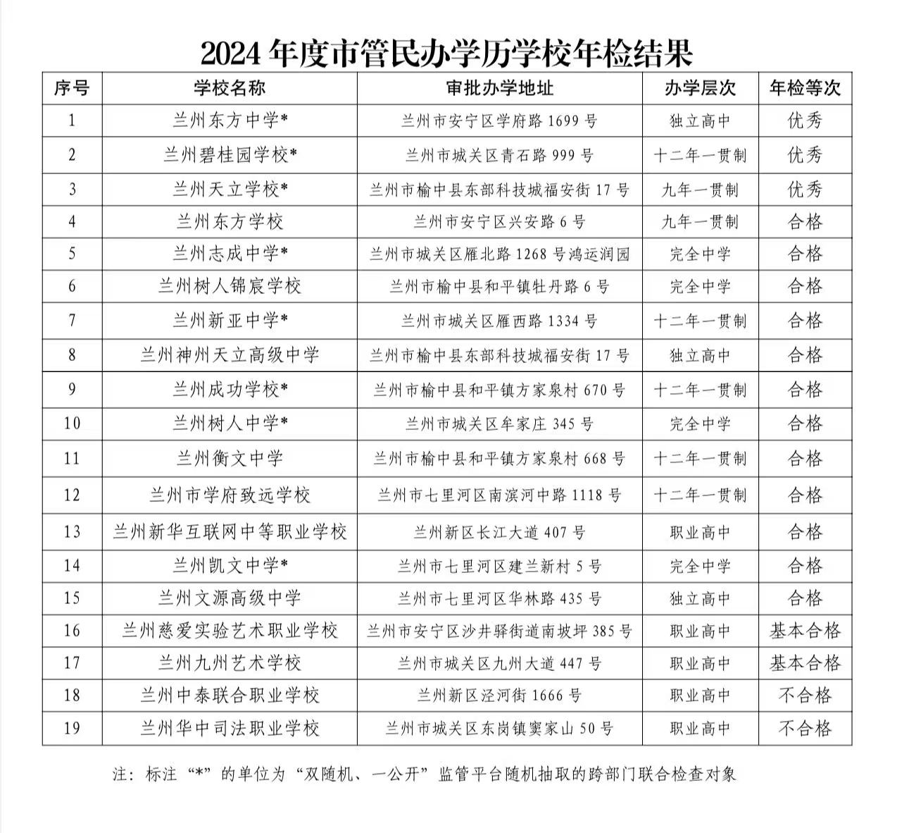 依據(jù)《中華人民共和國民辦教育促進(jìn)法》《中華人民共和國民辦教育促進(jìn)法實施條例》《甘肅省教育廳關(guān)于做好民辦學(xué)校2024年度年檢工作的通知》《甘肅省教育廳關(guān)于印發(fā)2025年度“雙隨機、一公開”監(jiān)管工作實施方案的通知》《關(guān)于開展市管民辦學(xué)歷學(xué)校2024年度年檢工作的通知》要求,蘭州市教育局組織完成了2024年度市管民辦學(xué)歷學(xué)校年檢工作,現(xiàn)將各學(xué)校年檢結(jié)果公告如下:
