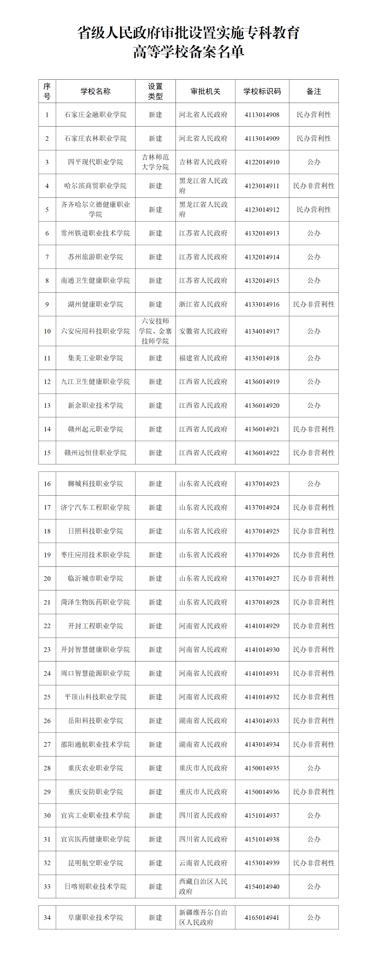 根據(jù)《中華人民共和國(guó)高等教育法》《普通高等學(xué)校設(shè)置暫行條例》等有關(guān)法律法規(guī)和政策文件的規(guī)定,現(xiàn)將省級(jí)人民政府審批設(shè)置的專科層次高等學(xué)校備案名單予以公布。