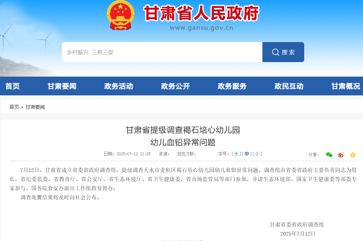 7月12日,甘肅省成立省委省政府調(diào)查組,提級(jí)調(diào)查天水市麥積區(qū)褐石培心幼兒園幼兒血鉛異常問題。調(diào)查組由省委省政府主要負(fù)責(zé)同志為組長(zhǎng),省紀(jì)委監(jiān)委、省教育廳、省公安廳、省生態(tài)環(huán)境廳、省衛(wèi)生健康委、省市場(chǎng)監(jiān)管局等部門參加,并請(qǐng)生態(tài)環(huán)境部、國家衛(wèi)生健康委等部委專家參與。國務(wù)院食安辦派出工作組指導(dǎo)督辦。