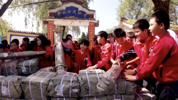 臨夏縣中山回民小學(xué)的學(xué)生們在搬運書籍