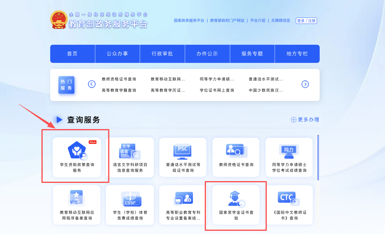 1.訪(fǎng)問(wèn)教育部政務(wù)服務(wù)平臺(tái)(https://zwfw.moe.gov.cn/,即教育部官方網(wǎng)站服務(wù)板塊),在“查詢(xún)服務(wù)”板塊,選擇使用“學(xué)生資助政策查詢(xún)服務(wù)”;