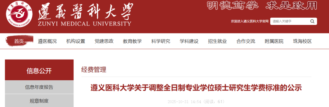 10月31日,遵義醫(yī)科大學發(fā)布《關于調整全日制專業(yè)學位碩士研究生學費標準的公示》,根據(jù)省教育廳2025年3月下發(fā)的《省教育廳關于進一步完善我省全日制專業(yè)學位碩士研究生學科分類學費標準及有關事宜的通知》有關精神,學校經(jīng)研究決定,擬在不超過文件規(guī)定的學科分類學費標準內調整現(xiàn)有全日制專業(yè)學位碩士研究生有關專業(yè)學費標準。
