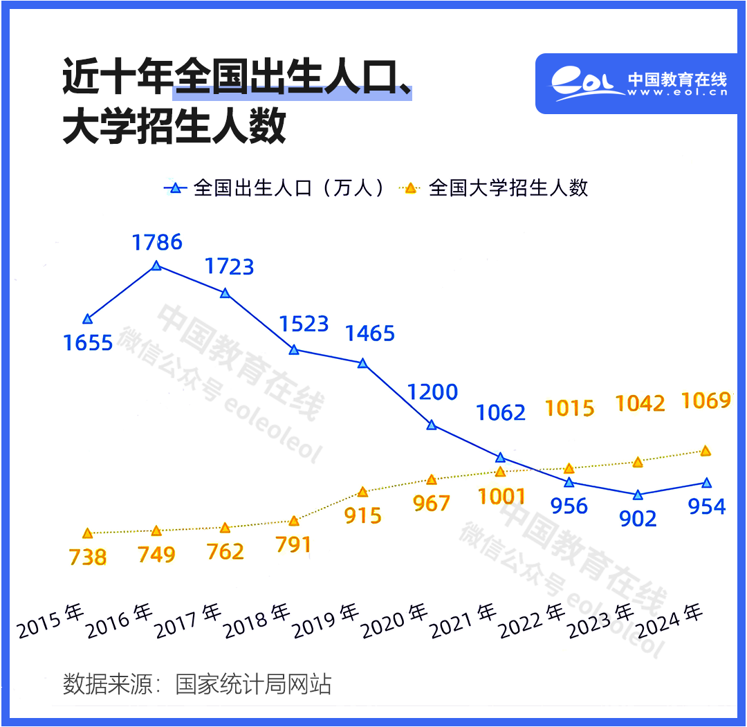 教育部2024年全國教育事業(yè)發(fā)展統(tǒng)計(jì)公報(bào)顯示,當(dāng)前我國各級(jí)各類學(xué)歷教育在校生達(dá)2.86億人,其中高等教育在學(xué)總規(guī)模已突破4000萬,2024年全國高校招生人數(shù)為1068.9萬人,創(chuàng)歷史新高。與之相對(duì)的是,2024年954萬的新生兒數(shù)量,即使18年后這些孩子全部健康成長(zhǎng),一個(gè)不流失,一個(gè)不分流,全去上大學(xué),也不夠大學(xué)招的。實(shí)際上,從2021年起,高校招生規(guī)模已突破1000萬,而2021年之后,新出生人口則一直在1000萬以下。