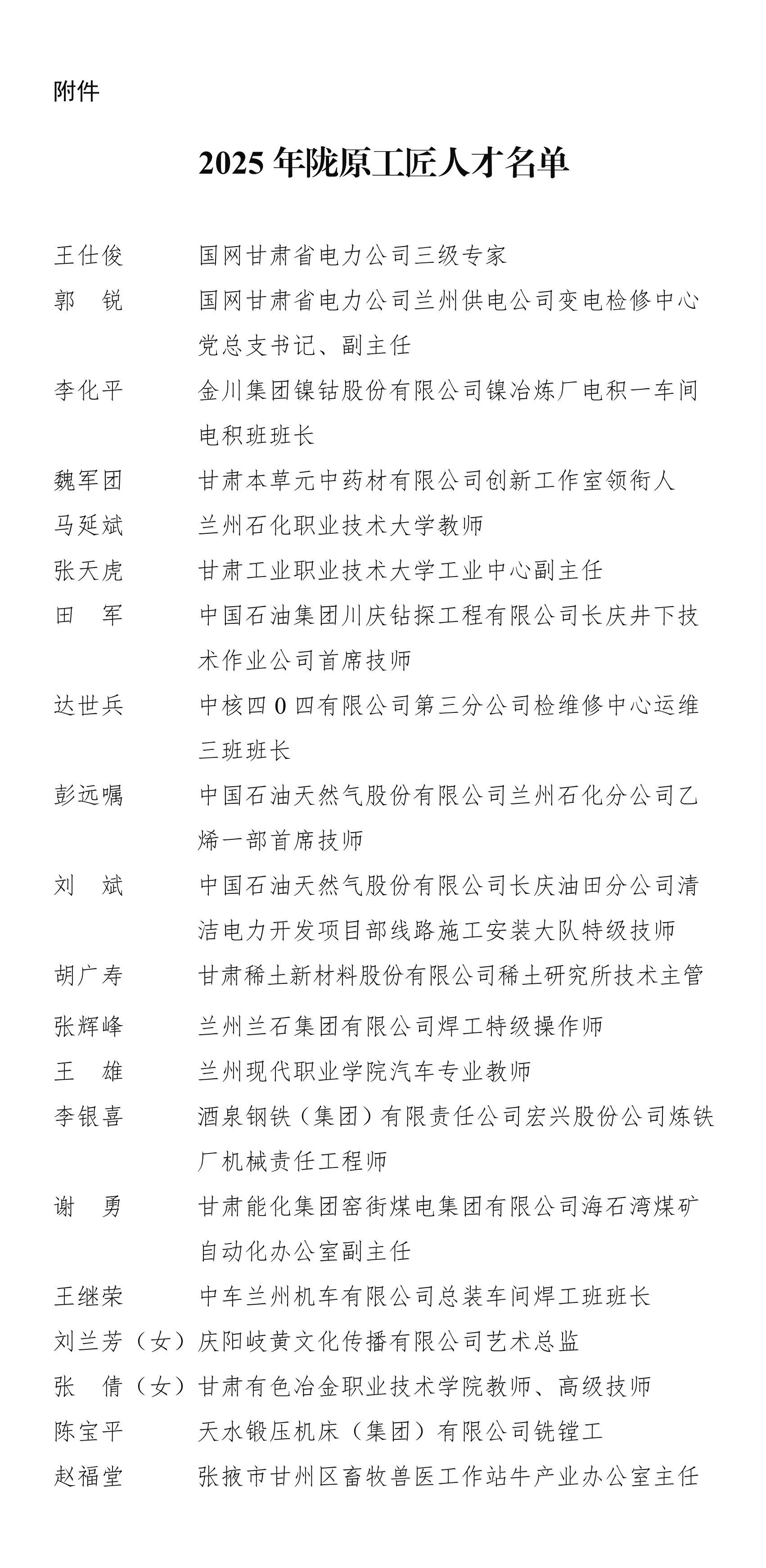 12月9日,在全省深化產業(yè)工人隊伍建設改革推進會暨重點產業(yè)鏈聯(lián)盟現(xiàn)場觀摩會上,2025年隴原工匠人才認定結果正式發(fā)布,王仕俊、郭銳、胡廣壽、謝勇等20名來自全省各行業(yè)杰出技能人才通過認定。