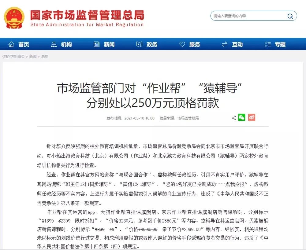 2021年5月10日,北京市市場(chǎng)監(jiān)管局依法對(duì)作業(yè)幫和猿輔導(dǎo)兩家校外教育培訓(xùn)機(jī)構(gòu),均處以警告和250萬元頂格罰款的行政處罰。