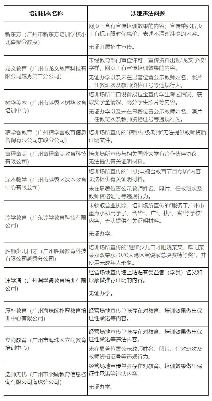 與此同時,教育部門檢查發(fā)現(xiàn)上述校外培訓(xùn)機(jī)構(gòu)中,部分機(jī)構(gòu)存在無證辦學(xué),或未在顯著位置公示教師姓名、照片、任教班次及教師資格證號的行為,依法立案處理。