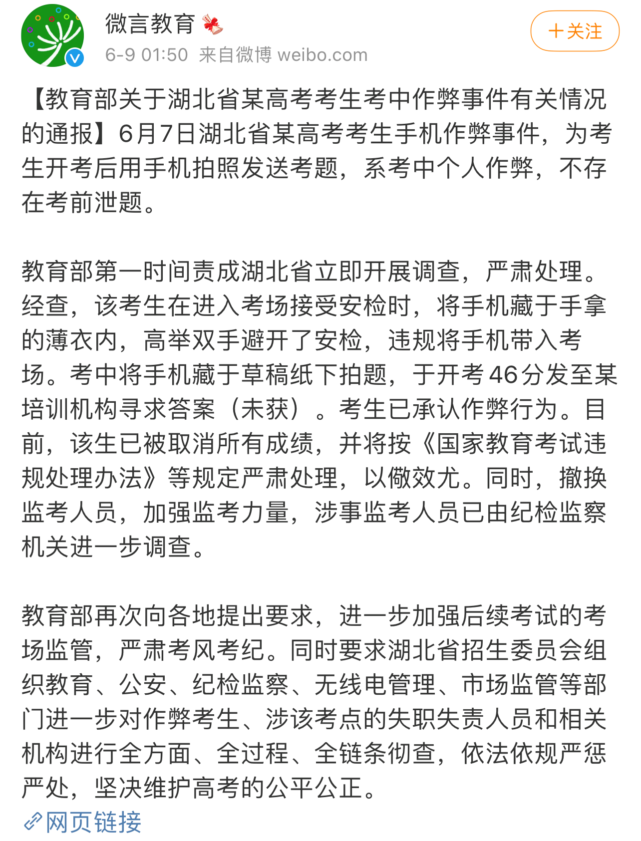6月9日凌晨2時(shí)許,據(jù)教育部新聞辦公室官方微博@微言教育 通報(bào),6月7日湖北省某高考考生手機(jī)作弊事件,為考生開考后用手機(jī)拍照發(fā)送考題,系考中個(gè)人作弊,不存在考前泄題。通報(bào)稱,教育部第一時(shí)間責(zé)成湖北省立即開展調(diào)查,嚴(yán)肅處理。經(jīng)查,該考生在進(jìn)入考場接受安檢時(shí),將手機(jī)藏于手拿的薄衣內(nèi),高舉雙手避開了安檢,違規(guī)將手機(jī)帶入考場??贾袑⑹謾C(jī)藏于草稿紙下拍題,于開考46分發(fā)至某培訓(xùn)機(jī)構(gòu)尋求答案(未獲)。考生已承認(rèn)作弊行為。目前,該生已被取消所有成績,并將按《國家教育考試違規(guī)處理辦法》等規(guī)定嚴(yán)肅處理,以儆效尤。同時(shí),撤換監(jiān)考人員,加強(qiáng)監(jiān)考力量,涉事監(jiān)考人員已由紀(jì)檢監(jiān)察機(jī)關(guān)進(jìn)一步調(diào)查。教育部再次向各地提出要求,進(jìn)一步加強(qiáng)后續(xù)考試的考場監(jiān)管,嚴(yán)肅考風(fēng)考紀(jì)。同時(shí)要求湖北省招生委員會(huì)組織教育、公安、紀(jì)檢監(jiān)察、無線電管理、市場監(jiān)管等部門進(jìn)一步對(duì)作弊考生、涉該考點(diǎn)的失職失責(zé)人員和相關(guān)機(jī)構(gòu)進(jìn)行全方面、全過程、全鏈條徹查,依法依規(guī)嚴(yán)懲嚴(yán)處,堅(jiān)決維護(hù)高考的公平公正。