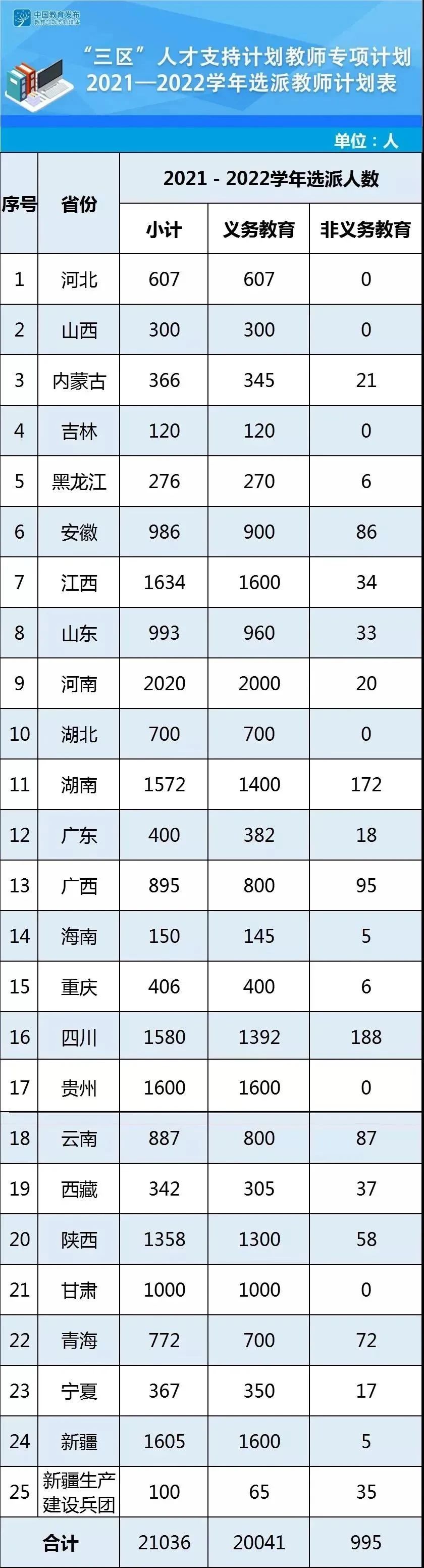 選派教師主要由各?。▍^(qū)、市)和新疆生產(chǎn)建設(shè)兵團(tuán)在本行政區(qū)域范圍內(nèi)調(diào)配,調(diào)動(dòng)省會(huì)城市、中心城市、非受援縣的優(yōu)質(zhì)教師資源支持省內(nèi)受援縣?!叭齾^(qū)”縣數(shù)量較多的省份,在派出教師范圍上可適當(dāng)放寬條件,采取市支持縣、縣支持鄉(xiāng)的方式予以解決。