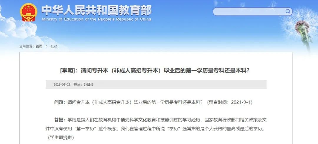 日前,教育部針對(duì)網(wǎng)友提問(wèn)“請(qǐng)問(wèn)專升本(非成人高招專升本)畢業(yè)后的第一學(xué)歷是??七€是本科?”進(jìn)行答復(fù)稱: