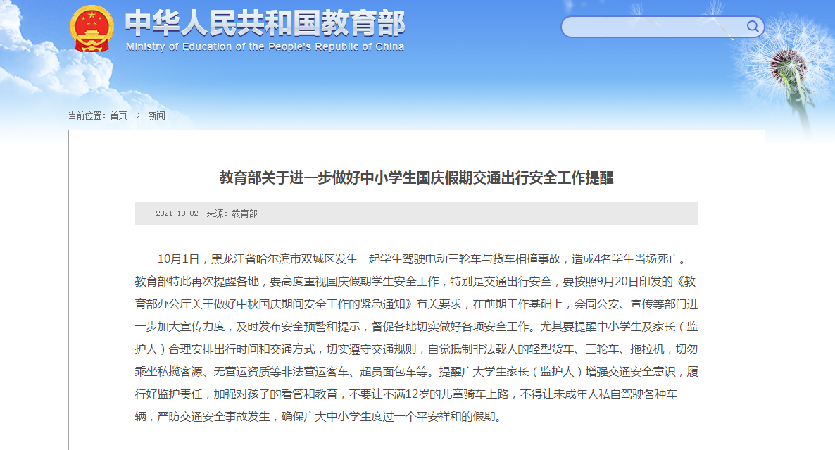 10月1日,黑龍江省哈爾濱市雙城區(qū)發(fā)生一起學(xué)生駕駛電動(dòng)三輪車與貨車相撞事故,造成4名學(xué)生當(dāng)場死亡。教育部特此再次提醒各地,要高度重視國慶假期學(xué)生安全工作,特別是交通出行安全,要按照9月20日印發(fā)的《教育部辦公廳關(guān)于做好中秋國慶期間安全工作的緊急通知》有關(guān)要求,在前期工作基礎(chǔ)上,會(huì)同公安、宣傳等部門進(jìn)一步加大宣傳力度,及時(shí)發(fā)布安全預(yù)警和提示,督促各地切實(shí)做好各項(xiàng)安全工作。