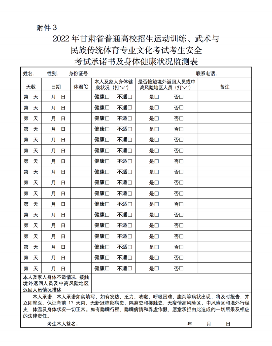 4.打卡合格的考生需持《2022年甘肅省普通高校招生體育藝術(shù)類專業(yè)準(zhǔn)考證》《身份證》《2022年運(yùn)動(dòng)訓(xùn)練、武術(shù)與民族傳統(tǒng)體育文化考試準(zhǔn)考證》和考前3天內(nèi)2次新冠肺炎核酸檢測(cè)陰性證明參加考試;打卡不合格的考生須持《2022年甘肅省普通高校招生運(yùn)動(dòng)訓(xùn)練、武術(shù)與民族傳統(tǒng)體育專業(yè)文化課考試考生安全考試承諾書及身體健康狀況監(jiān)測(cè)表》(見附件3)、《2022年甘肅省普通高校招生體育藝術(shù)類專業(yè)準(zhǔn)考證》《身份證》《2022年運(yùn)動(dòng)訓(xùn)練、武術(shù)與民族傳統(tǒng)體育文化考試準(zhǔn)考證》和考前3天內(nèi)2次新冠肺炎核酸檢測(cè)陰性證明按相關(guān)要求參加考試。