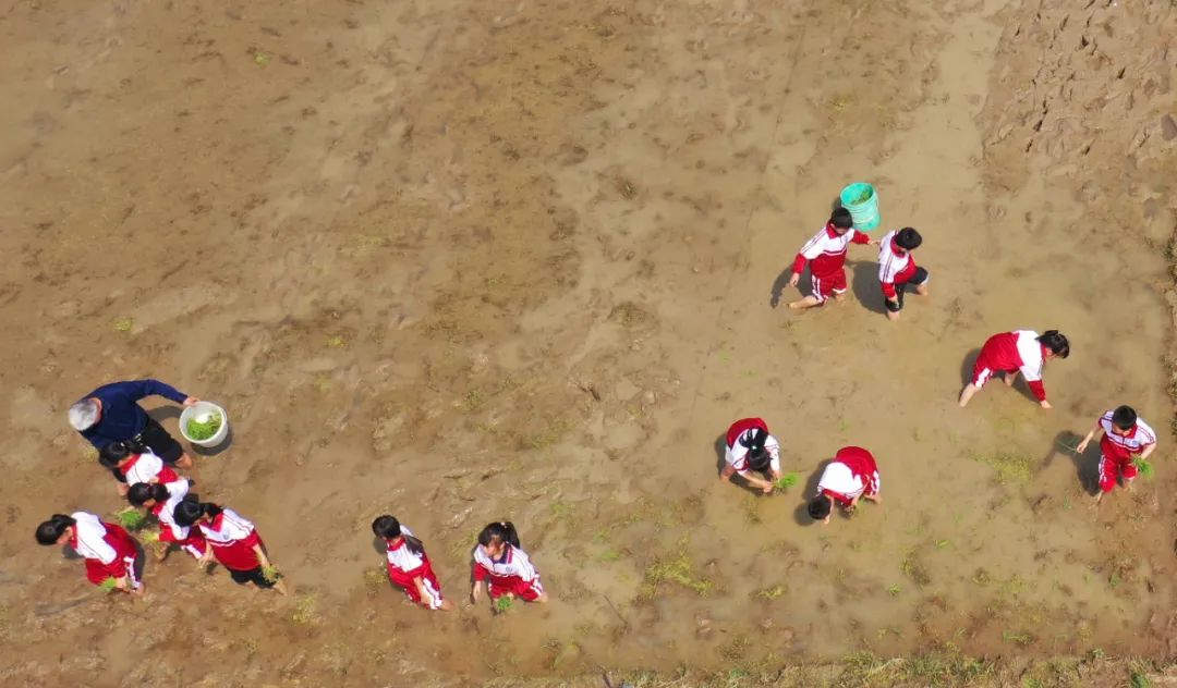 △江西吉安:小學生田間勞動課,體驗早稻拋秧。