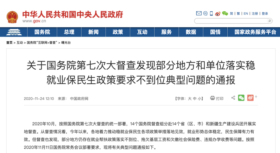中國(guó)政府網(wǎng)11月24日發(fā)布《關(guān)于國(guó)務(wù)院第七次大督查發(fā)現(xiàn)部分地方和單位落實(shí)穩(wěn)就業(yè)保民生政策要求不到位典型問(wèn)題的通報(bào)》,通報(bào)中提到,督查發(fā)現(xiàn),部分地方仍存在就業(yè)幫扶政策落實(shí)不到位、拖欠基層工資和欠繳社會(huì)保險(xiǎn)費(fèi)、違規(guī)辦學(xué)收費(fèi)等問(wèn)題。