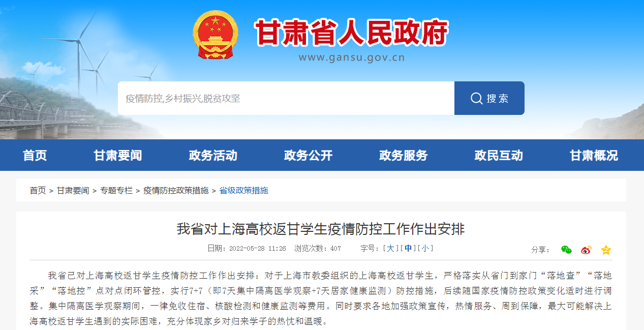 甘肅省對上海高校返甘學(xué)生疫情防控工作作出安排