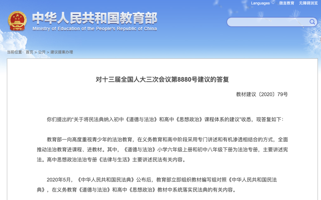 答復中強調(diào),教材納入了民法典制定、實施的重大意義等內(nèi)容,幫助學生充分認識民法典對個人、社會、國家的重大意義。
