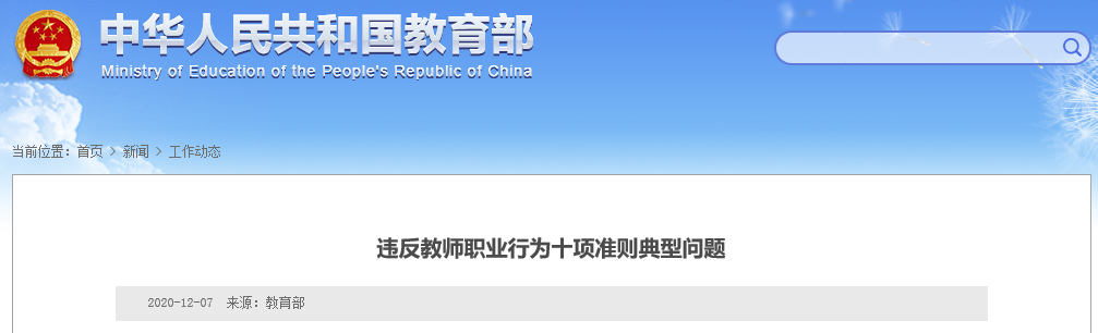 日前,教育部對(duì)8起違反教師職業(yè)行為十項(xiàng)準(zhǔn)則典型問(wèn)題進(jìn)行公開曝光。這8起典型問(wèn)題是: