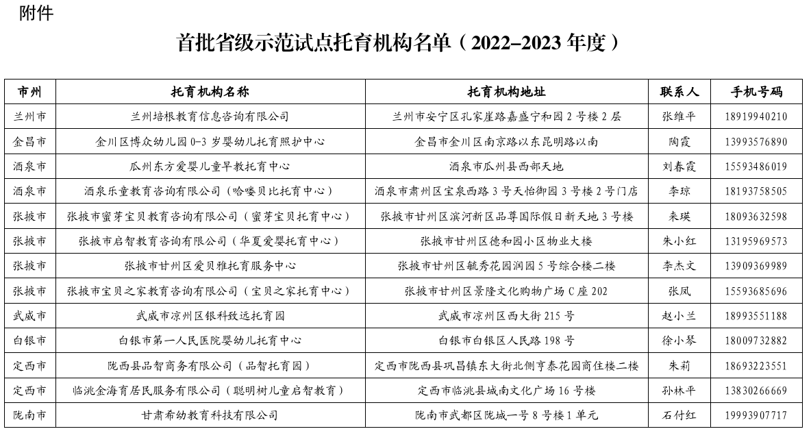 為深入貫徹落實(shí)國家和省上關(guān)于促進(jìn)托育服務(wù)健康發(fā)展的決策部署,充分發(fā)揮示范性托育機(jī)構(gòu)的輻射帶動(dòng)作用,推動(dòng)全省3歲以下嬰幼兒照護(hù)服務(wù)工作專業(yè)化、規(guī)范化發(fā)展,根據(jù)《關(guān)于創(chuàng)建省級(jí)示范試點(diǎn)托育機(jī)構(gòu)的通知》(甘衛(wèi)家庭函〔2021〕210?號(hào))要求,經(jīng)托育機(jī)構(gòu)自評(píng)申報(bào)、市縣主管部門逐級(jí)審核推薦、委托第三方現(xiàn)場審核、省衛(wèi)生健康委審定并公示,決定命名蘭州培根教育信息咨詢有限公司等13所托育機(jī)構(gòu)為甘肅省首批省級(jí)示范試點(diǎn)托育機(jī)構(gòu)并授牌,示范周期為2022-2023年度。