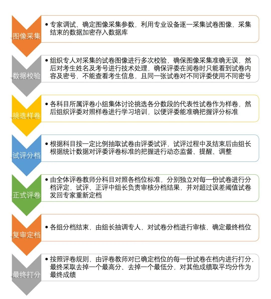 評(píng)卷分美術(shù)、書法、唐卡三個(gè)專業(yè)進(jìn)行。整個(gè)評(píng)卷流程分七步:第一步,試卷圖像采集。由專家調(diào)試、確定圖像采集參數(shù),利用專業(yè)設(shè)備逐一采集試卷圖像,采集結(jié)束的數(shù)據(jù)加密存入數(shù)據(jù)庫(kù)。第二步,數(shù)據(jù)校驗(yàn)。組織專人對(duì)采集的試卷圖像進(jìn)行多次校驗(yàn),確保圖像采集準(zhǔn)確無(wú)誤,然后對(duì)考生姓名及考號(hào)進(jìn)行技術(shù)處理,確保評(píng)委在評(píng)卷時(shí)只能看到試卷內(nèi)容及密號(hào),不能查看考生信息,且同一張?jiān)嚲韺?duì)不同評(píng)委使用不同密號(hào)。第三步挑選樣卷。各科目所屬評(píng)卷小組集體討論挑選各分?jǐn)?shù)段的代表性試卷作為樣卷,然后組織評(píng)委對(duì)照樣卷進(jìn)行學(xué)習(xí)培訓(xùn),以便評(píng)委能準(zhǔn)確把握評(píng)分標(biāo)準(zhǔn)。第四步,試評(píng)分檔。根據(jù)科目按一定比例抽取試卷由評(píng)委試評(píng),試評(píng)過(guò)程中及結(jié)束后由組長(zhǎng)根據(jù)統(tǒng)計(jì)數(shù)據(jù)對(duì)評(píng)委評(píng)卷標(biāo)準(zhǔn)的把握進(jìn)行動(dòng)態(tài)監(jiān)督、提醒、調(diào)整。第五步,正式評(píng)卷。由全體評(píng)卷教師分科目對(duì)照各檔位標(biāo)準(zhǔn),獨(dú)立對(duì)每一份試卷進(jìn)行分檔評(píng)定。試評(píng)、正評(píng)中組長(zhǎng)負(fù)責(zé)審核分檔結(jié)果,并對(duì)超過(guò)誤差閾值試卷發(fā)回專家重新定檔。第六步,復(fù)審定檔。各組分檔結(jié)束,由組長(zhǎng)抽調(diào)專人,對(duì)試卷分檔進(jìn)行審核,確定最終檔位。第七步,最終打分。按照評(píng)卷規(guī)則,由評(píng)卷教師對(duì)已確定檔位的每一份試卷在檔內(nèi)進(jìn)行打分。最終采取去掉一個(gè)最高分、去掉一個(gè)最低分,對(duì)其他成績(jī)?nèi)∑骄肿鳛樽罱K成績(jī)。