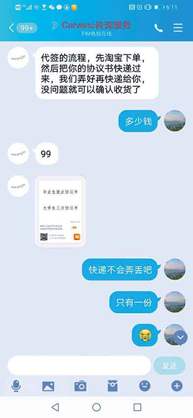 “輔導員將三方協(xié)議寄給我們,讓大家自己找單位蓋章簽字,否則不給畢業(yè)?!卑不招氯A學院應屆畢業(yè)生鄭偉明說,雖然近期準備專升本考試,沒時間去找企業(yè)簽訂三方協(xié)議,但實在經(jīng)不住輔導員三番五次催促,不得不托熟人找關系,輾轉多方才找到一家企業(yè)簽字蓋章。